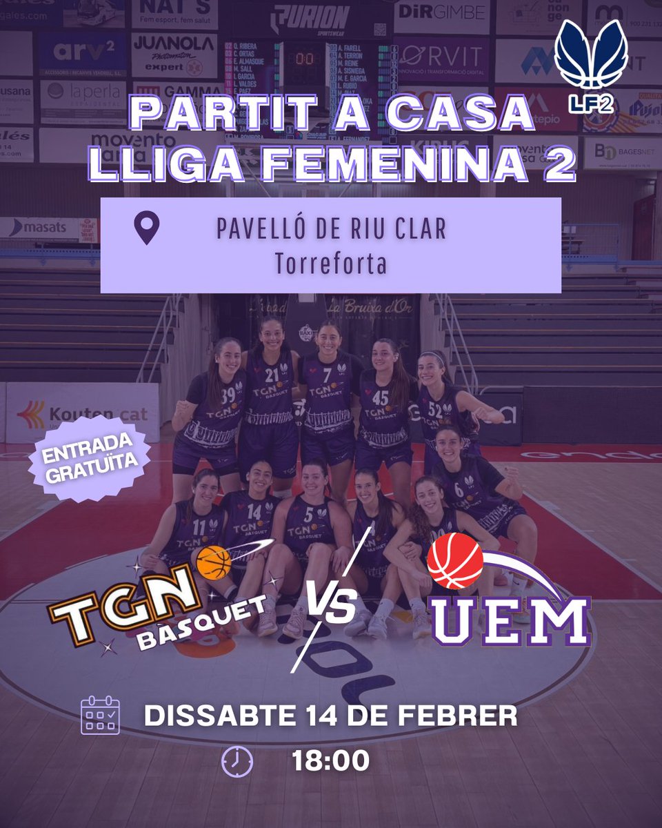 💜🏀 DISSABTE DE PARTIT A RIU CLAR! 💪 Aquest dissabte, el LF2 del @TGNBasquet s'enfronta en el derbi català davant el @uemataro per seguir creixent i aprenent a la categoria. 🏡Us necessitem per fer-nos costat! #tgnbasquet #LF2 #adntgn